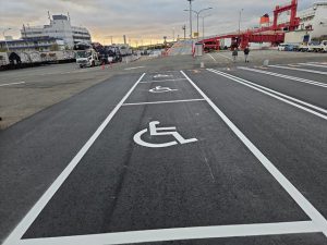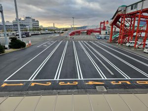 今回は六甲アイランドのフェリーターミナルにて舗装工事が行われましたので、その後の駐車枠の白線復旧の完成状況を載せています。